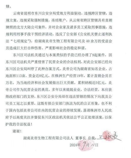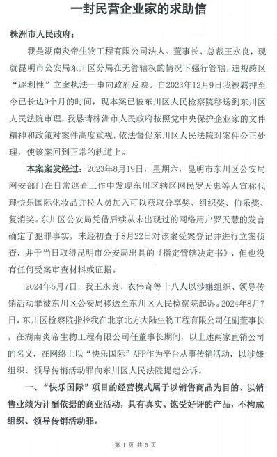 【编者按】法讯网收到一封湖南民营企业家的求助信,现全文发出,不代表本网观点,供各位网友甄别。 一封民营企业家的求助信 株洲市人民政府: 我是湖南炎帝生物工程有限公司法人、董事长、总裁王永良,现就昆明市公安局东川区分局在无管辖权的情况下强行管辖,违规跨区“逐利性”立案执法一事向政府反映。自2023年12月9日我被羁押至今已长达9个月的时间,现本案已被东川区人民检察院移送到东川区人民法院审理,我恳请株洲市人民政府按照党中央保护企业家的文件精神和政策对案件高度重视,依法督促东川区人民法院对案件公正处理,使该案回到正常的轨道上。 本案案发经过:2023年8月19日,星期六,昆明市东川区公安局网安部门在日常巡查工作中发现东川区辖区网民罗天惠等人宣称代理快乐国际化妆品并拉人员加入可以获取分享奖、组织奖、伯乐奖、复消奖。东川区公安局凭借后续从未出现过的网络用户罗天慧的发言确定了犯罪事实,未经初查于8月22日对该案受案登记并进行立案侦查,并于当日取得昆明市公安局出具的《指定管辖决定书》,但也没有任何受案审查材料或证据。 2024年5月7日,我王永良、衣伟奇等十八人以涉嫌组织、领导传销活动罪被东川区公安局移送至东川区人民检察院起诉。2024年8月7日,东川区检察院指控我在北京北方大陆生物工程有限公司任副董事长,在湖南炎帝生物工程有限公司任董事长期间,以上述两家直销公司的名义,在网络上以“快乐国际”APP作为平台从事传销活动,以涉嫌组织、领导传销活动罪向东川区人民法院提起公诉。 一、“快乐国际”项目的经营模式属于以销售商品为目的、以销售业绩为计酬依据的商业活动,具有真实、饱受好评的产品,不构成组织、领导传销活动罪。 “快乐国际”APP先后归属“大连双迪生物工程有限公司”、“北京北方大陆生物工程有限公司”(以下简称“北方大陆”)、“湖南炎帝生物工程有限公司”(以下简称“炎帝公司”)所有,是这三家均具有直销牌照的公司不可分割的板块,所有收入及管理也都归属上述三家公司。“北方大陆”“炎帝公司”两家公司都是具有商务部颁发直销牌照的合法企业,在直销业内有一定的影响。 炎帝公司卖的是一系列合法合规的产品,具备完善的产品生产、销售资质及检测报告,生产、销售至今没有出现任何一列产品质量问题,更没有因产品问题给任何消费者造成身体健康的伤害。我非常不解一个真心实意卖产品,没有安全事故、没有受害者、没有违法犯罪纪录的企业,我竟在没有任何告知、提醒的情况下直接被昆明东川公安采取强制措施。 我们公司的产品均通过了公安部门寻找鉴定机构的质量检验。众多会员的也表述是因为看到身边人使用了我们公司的产品,有了良好的效果想要寻找途径购买才加入了快乐国际会员,关于商品会员也均表述为“实惠”、“未高于市场价”、“快乐国际的便宜”、“是合格产品”,“认可产品的功效”、“看别人脸变好了才购买”,从此可知会员充分认可我们的产品,也确实给会员带来了实惠,完全属于公平合理的市场价,并没有虚高价格,更非是“道具产品”。我们的消费者通过购买产品累计消费免费成为会员,我们产品三分之二以上的流水收入主要来源于会员的二次、多次复购消费,也并非是所谓的“人头业绩”。 “快乐国际”是炎帝公司众多直销队伍中的一个团队,卖的是产品,更没有受害者。通过公司自查,至今没有任何消费者向昆明市市场监督管理局有过投诉或报案,昆明市市场监督管理局对此事也完全不知情,更谈不上立案。 二、东川区公安局偏离了法治轨道,以远洋捕捞式趋利性执法强行将本案纳入管辖,迅速冻结企业、个人及本案无关人员账户钱款3000万余元。 (一)快乐国际APP先后是“北方大陆”、“炎帝公司”的直销项目“北方大陆”、“炎帝公司”这两家公司都是具有商务部颁发的直销牌照的合法直销企业,我以前在北方大陆公司担任副董事长兼总裁,目前是炎帝生物的投资人、法人、董事长、总裁,其一直是履行职务行为。 2019年6月份,我作为北方大陆的创始人之一经北方大陆董事长邹忠全的邀请回到北方大陆任职副董事长、全球总裁,不再担任大陆双迪的市场顾问一职。快乐国际APP是一个以系统命名的网络,快乐国际系统是2020年3月才进入北方大陆公司,不属于我个人。2022年,北方大陆董事长邹忠全准备叫停直销板块,我就于2023年1月经介绍投资了炎帝公司,成为了炎帝公司的法人、董事长、总裁。由于北方大陆董事长邹忠全不再做直销板块,就将快乐国际APP数据直接转给了炎帝公司,成为了炎帝公司的一个部门和板块,2023年10月,快乐国际系统合并到炎帝会员+系统中。 云南省昆明市东川公安分局违规跨区域管辖具有直销牌照的炎帝公司,人为将快乐国际APP与我先生画等号,把我作为网络第一人违规进行刑事立案。我从来没有进入、使用过APP后台,我仅仅履行公司管理职责。 (二)东川区公安局虚构受案事实,也无任何证据证明东川区对本案有管辖权 根据《最高人民法院关于适用<中华人民共和国刑事诉讼法>的解释》第六十四条:“应当运用证据证明的案件事实包括:……(九)有关管辖、回避、延期审理等的程序事实”。本案中,立案时没有任何实质证据的情况下直接指定管辖,在公安机关后