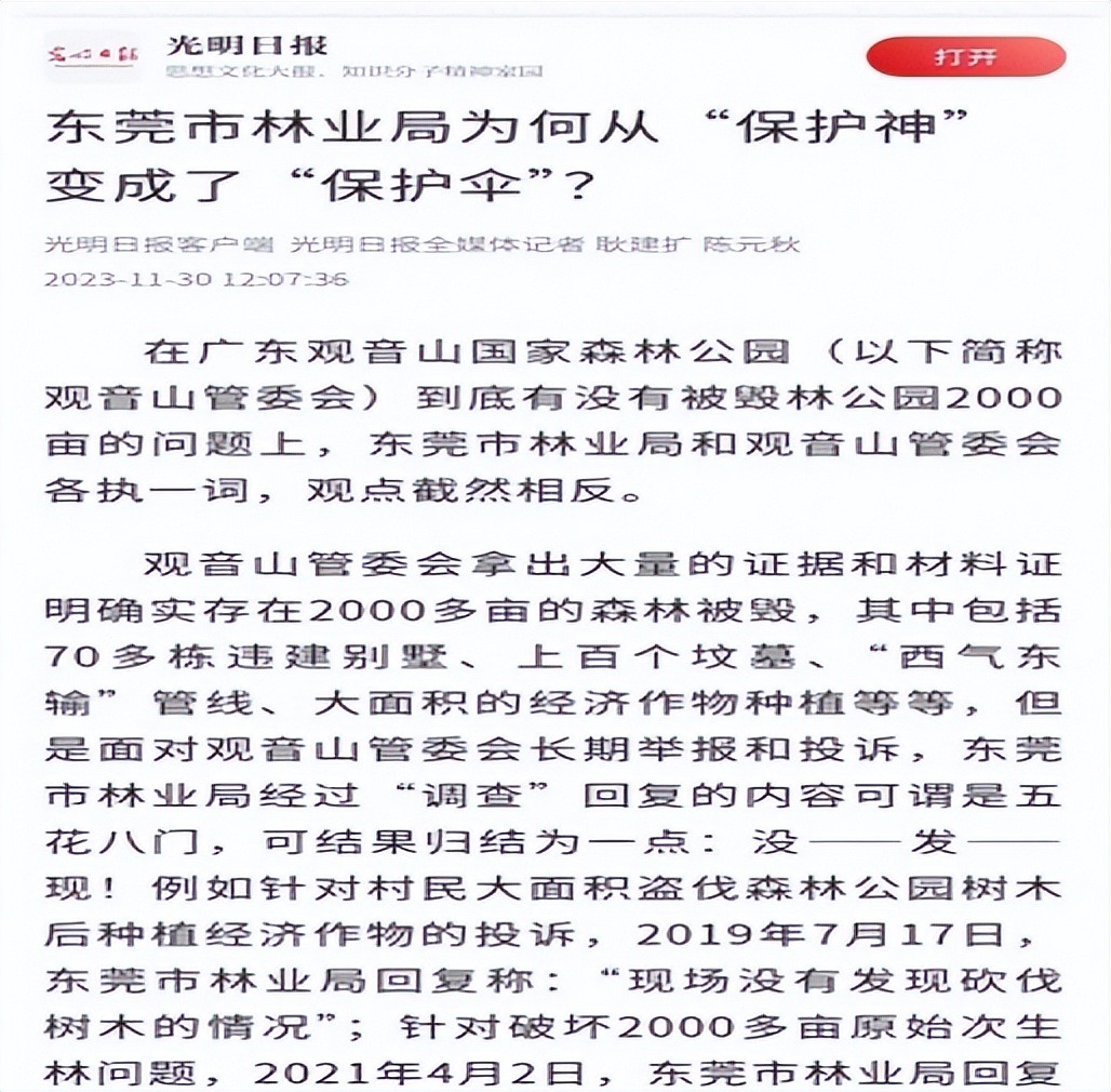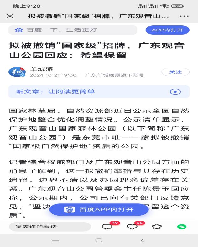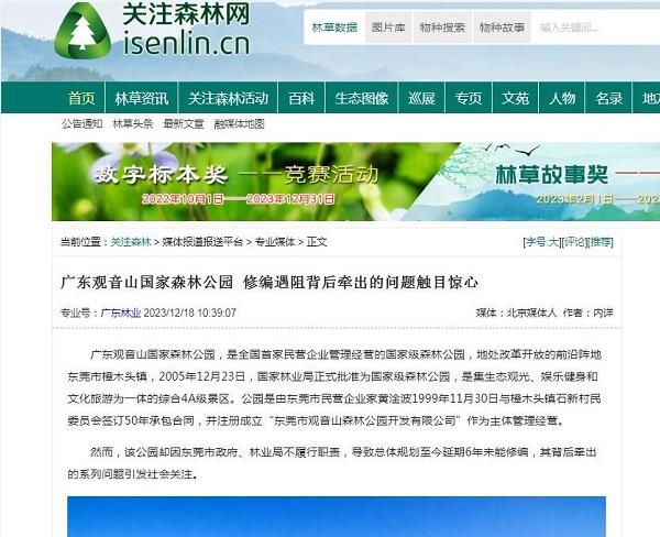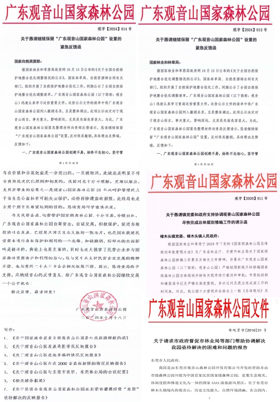 | 广东观音山国家森林公园不再保留,谁之过 遭遇地方多年卡脖,首家民营国家森林公园竟不再保留 独立撰稿人 李海波 广东观音山国家森林公园是南中国知名的网红打卡旅游目的地,森林覆盖率为92%以上,园内繁衍着近千种野植物和300余种野生动物,还有全世界首家古树博物馆。观音山是集森林氧吧、文化体验、姻缘许愿于一体的国家AAAA级旅游风景区,被誉为“南天灵秀胜境,森林康养福地。被国家林业与草原局称为“全国生态样本公园”。 ![]() 1999年东莞企业家接手观音山时还是一片无人问津的荒山,没有任何基础设施,他们从零开始,遵循生态优先原则,坚持绿色发展,适度开展旅游设施建设,持续进行公园的升级美化,陆续投入超过十亿元。2005年12月23日,广东观音山国家森林公园经国家林业局批准成立,成为全国第一座民营国家森林公园,规划面积为18平方公里。之后观音山发展迅猛,一举成为全国发展森林文化旅游事业的成功典范:原国家林业局发文评价“广东观音山国家森林公园是全国的一块样板”、联合国授予“国际生态旅游示范基地”、国际生态安全旅游示范基地、联合国环境规划署授予“中国最具发展潜力的企业”、国际旅游联合会评定为“最美中国旅游目的地”、中国国土经济学会授予观音山景区“深呼吸旅游度假区”、国家旅游局评为国家4A旅游景区、中国休闲旅游最佳目的地、中国十佳休闲景区、广东人最喜爱的旅游目的地、 森林美景摄影地、粤港澳大湾区年度最佳生态旅游企业...... ![]() 2007年,在黄淦波的带领下,观音山森林公园的管理者们对18平方公里的森林资源进行了区域规划,根据山体的走势和植被的生长环境等划定了保护区、生态核心区及适度开发区三大区域。此后,园方还加大了对生态区的保护及修复力度,尤其是对名贵树种的保护:每棵名贵树木都挂上了科普牌并登记造册,定期派专人对这些树木展开线松虫、白蚁的防治。 因行业影响和社会贡献突出,观音山公园董事长黄淦波2007年3月1日和2008年3月5日及2012年3月5日,黄淦波同志作为特邀代表三次到北京参加“两会”...... 2013年10月,黄淦波获得中国绿化基金会、人民网、绿色中国年度焦点人物评选组委会、绿色中国杂志社联合颁发的“2012绿色中国年度焦点人物创新人物奖” 黄淦波打造的是“有特色”的公园,为此马不停蹄地举办文化或公益活动,每年都举行了东莞观音山诗歌节、健康文化节、粤港万人相亲会、文学创作活动、传统文化体验行动......2021年5月,观音山景区荣获“中国楹联文化名山”、“广东省楹联文化示范山”荣誉称号。2021年10月,中国散文学会授权观音山景区创立“中国散文学会创作基地”,2023年8月,中国作协社联部和中国林业生态作家协会授予广东观音山国家森林公园“生态文学创作实践基地”。![]() 2023年11月23日深圳特区报的要闻报道,文末说在未来5至10年内,东莞观音山力争将公园建设成为达到国家5A级旅游标准的景区,依托森林资源,积极探索森林养生、森林体验、森林康养等健康旅游新模式,加快发展多元化、多层次的森林旅游新业态,助推新旧动能转换,守住绿水青山,打造生态名山。 ![]() 今年5月,“名联咏名山”首届楹联文化研讨会在观音山举行,观音山因此跻身“六岳”文化名山。 按理说观音山公园取得如此骄人的成绩,当地政府应该是多方面给予大力扶持吧?然而25年来,观音山却受到了东莞市多部门的持续打压,给观音山带来来不可估量的损失,使其发展不畅甚至是举步维艰! ![]() 这不就在10月15日,据国家林草局、自然资源部的公示内容,全国自然保护地将由现有的9240处,整合优化为6736处,2500多处自然保护地被撤并。公示内容显示,涉及东莞的自然保护地达到36个之多,大多数为保留、被撤并,只有“广东观音山国家森林公园”为“撤销”。 观音山被撤销早有预兆 ![]() 观音山公园将失去“国家级自然保护地”资质,其实早有预兆。2021年12月,由广东省自然资源厅、广东省林业局联合发布的《广东省自然保护地规划(2021-2035年)》(以下简称广东规划)就明确称,拟不再保留的142处自然保护地包括自然保护区、森林自然公园、湿地自然公园三类,其中国家级1处为广东观音山国家森林公园,其余均为市县级自然保护地。 除此之外,各级媒体多次曝光观音山编修问题时都曾担忧:编修无法推进,国家森林公园将会摘牌。 ![]() 10月21日,羊城晚报发布《拟被撤销“国家级”招牌,广东观音山公园回应:希望保留》,文中显示:此次观音山公园将失去“国家级自然保护地”资质,其实早有预兆。2021年12月,由广东省自然资源厅、广东省林业局联合发布的《广东省自然保护地规划(2021-2035年)》(以下简称广东规划)就明确称,拟不再保留的 142处自然保护地包括自然保护区、森林自然公园、湿地自然公园三类,其中国家级1处为广东观音山国家森林公园,其余均为市县级自然保护地。 关于观音山公园为何不再被保留为森林自然公园资质,记者从“广东规划”中便能得知一二。广东规划称,拟撤销的自然公园多为存在较多的城镇建成区、村庄等人为活动矛盾点,对问题点位进行核查处理后,余下的自然公园破碎化严重,生态资源完整性不复存在,保护价值偏低。 记者21日从东莞市林业局有关人士获悉,观音山公园之所以拟被撤销“国家级自然保护地”是因为存在
