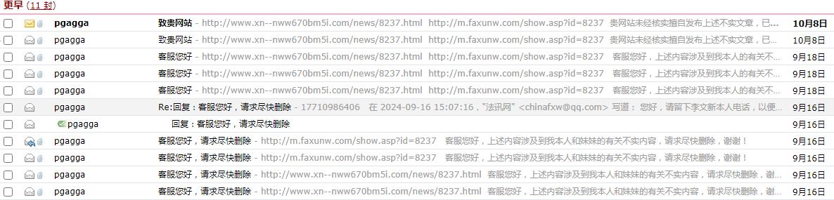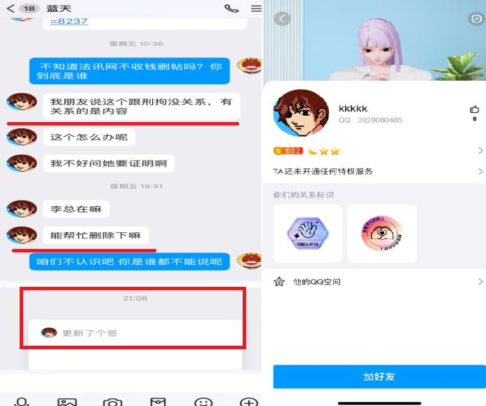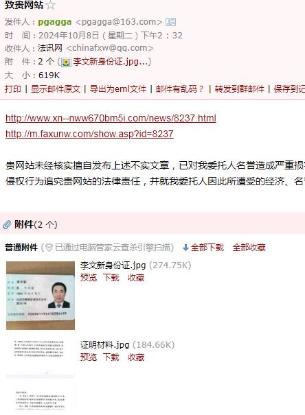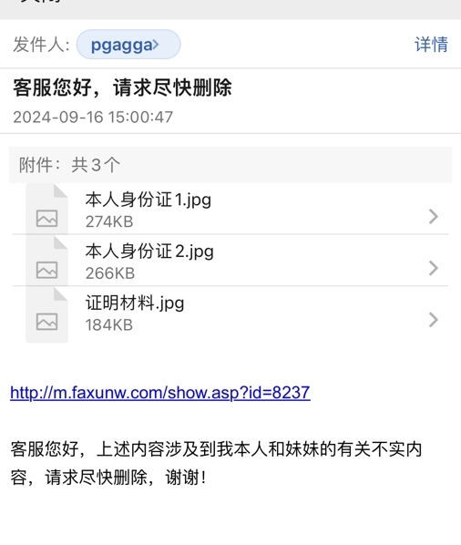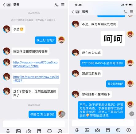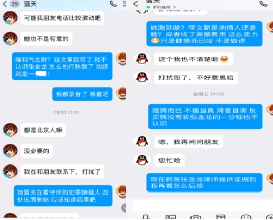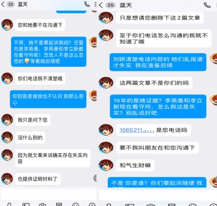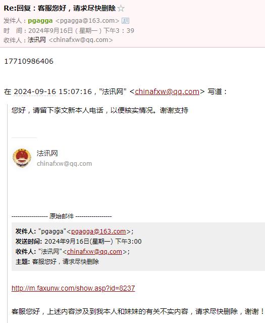 | 为哪般!南方周末实习生竟假冒犯罪嫌疑人删帖? 文 李海波 法讯君遇到了一件匪夷所思的事,疑似南方周末实习生刘某冒充犯罪嫌疑人非法删帖:发邮件后电话威逼不成,之后又找朋友加QQ联系花钱删帖…… ![]() 9月16日,法讯网收到了自称李文新的邮件:客服您好,请求尽快删除。邮件内容很简单:“客服您好,上述内容涉及到我本人和妹妹的有关不实内容,请求尽快删除,谢谢!”说服附件为李文新身份证和2019年北京市检察院第二分院回复张金龙等人的《不支持监督申请决定书》。 ![]() 打开链接内容是《涉虚假诉讼,莆商李文新妹妹及堂兄被北京警方刑拘》。该邮件在当天连发4次,于是法讯君回复:“您好,请留下李文新本人电话,以便核实情况。谢谢支持”对方当即回复了电话号码。 法讯君在当天下午16时致电该号码,没有接听。16:47对方打来电话,自称是李燕香。她首先指责说你写的东西不属实,我们现在是友好的协商嘛。法讯君表示刚联系对方的律师说你们现在应该还在看守所。她说;收监不收监的你写的东西不属实,你最近有关注这个法治的这些报道吧?你应该知道张金龙付费包括那个律师应该和张金龙这边沟通了对吧?法讯君答复不认识张金龙。她便质问:不管你认识不认识我们肯定会起诉你的。因为里面有些材料怎么来的?这个刑事是机密的,为什么会有这个东西。你哪来的我问你在这里面是涉密的东西?第二点就是不管是说他说他是什么员工你要拿出证据对吧?很多东西他说他这里面其中的一些人说的这些事实你知道怎么写自述吧或者他自称这个东西有被认定吗?这么写合适吗?法讯君答复是李金林说的,都有录音。对方说:李海波,我现在跟你说的是我们认为这个现在涉及到非法违法的东西,你好意思放在外头吗?你这个东西都是假的全都是瞎编乱造的,如果你再不撤的话我们会起诉你!张金龙行贿你的事实你知道嘛!法讯君反问:张金龙给我钱了?她马上说:对呀。法讯君答复,张金龙我都不认识我怎么收钱?她说:你查一下张金龙行贿然后你搜一下。法讯君答复:即使张金龙给我钱也不是行贿!和你这种人没啥说的!之后便挂断电话。她再次电话来,没说什么就挂断了。 法讯君联系莆田那边朋友,他说李燕香和李文新都在看守所不可能电话呀,他熟悉李燕香声音。在把电话录音发去后,他说这绝对不是李燕香,估计是南方周末那个实习生刘某! 9月18日,该邮箱三次给法讯网发邮件表达同样内容。 ![]() 9月20日,有昵称“蓝天”加法讯网QQ好友,进行了以上对话。对方还是想删除网帖《涉虚假诉讼,莆商李文新妹妹及堂兄被北京警方刑拘》,在法讯君询问对方是否刘记者(南方周末实习生刘妍)时,对方答复不是,他是帮朋友处理的。在法讯君询问给法讯君打电话的号码不是他的,其答复也不是,是他朋友的。 ![]() 聊天中对于法讯君说的刘某电话说要起诉的话其答复,可能我朋友电话比较激动吧,她也不是有意的。 ![]() 9月26日,法讯君告诉需要提供证明。 对方询问法讯君:必须要提供证明嘛 我问了朋友没有答复。 法讯君:你是哪位?不是和刘妍一起的?(法讯君怀疑是和刘妍一起的南方周末记者)蓝天:她委托我处理的哦 我刚问她没有回复呢 之后他直接表示到时候给些小费都行 之后更是直接说删除的话多少钱呢 是2个,并再次发来二个网页链接。 第二天上午法讯君看见信息后答复:不知道法讯网不收钱删帖吗?你到底是谁 蓝天:我朋友说这个跟刑拘没关系,有关系的是内容 ![]() 在19:51蓝天继续联系法讯网:李总在吗 能帮忙删除下嘛 法讯君便问:咱们不认识吧 你是谁都不能说呢 此后双方在没有交流,之后法讯君发现对方QQ改了昵称,并且删除了法讯君。 ![]() 10月8日,该邮箱发来二次信息:贵网站未经核实擅自发布上述不实文章,已对我委托人名誉造成严重损害。限贵网站7日之内删除上述侵权文章,如贵网站逾期未履行上述义务,我委托人将立即采取相应的法律手段就贵网站的侵权行为追究贵网站的法律责任,并就我委托人因此所遭受的经济、名誉损失向贵网站索赔,一切法律后果均由贵网站承担! ![]() 该邮箱pgagga@163.com共向法讯网发来11封几乎同样的内容,看来是相当的执着啊。 他们要花钱删除的这个重要内容是什么呢?您可以看看法讯网在2021年1月25日发布的《涉虚假诉讼,莆商李文新妹妹及堂兄被北京警方刑拘》。 之后法讯君搜索网络发现有署名南方周末记者翟星理 南方周末实习生刘妍的文章《一场有争议的虚假诉讼:为立案行贿警察两百余万元》显示:2021年7月29日,丰台分局以李文新、李燕香、李金林涉嫌虚假诉讼罪向丰台区人民检察院移送审查起诉。2021年8月25日,丰台区检察院向丰台区法院提起诉讼。“拖”了两年多之后,2023年1月10月,案件重新恢复审理。但北京市丰台区法院又h于2023年2月、5月、8月、11月,先后4次批准延期3个月审理。2023年12月7日,案件被指定由北京市东城区检察院管辖。东城区检察院以事实不清、证据不足为由,退回侦查机关补充侦查1次。2024年2月6日,补充侦查工作结束。23天之后,东城区检察院向东城区法院提起公诉。不过,被告人由此前的李文新、李燕香、李金林3人,变为只有李金林一人。李燕香、李金林被分案处理,被控罪名与犯罪事实没有变化,两人同日被东城区检察院诉至东城区法院。起诉书显示,李金林已于2023年12月7日被取保候审。这