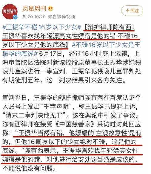 本来,水母对于上市公司董事长王振华猥亵9岁女童一案,并无太多关注。 前几天法院一审给王振华判了个5年,水母也只是简单扫了一眼标题,压根连新闻的正文都没点进去看。 但是就在昨天,一条新闻让水母直接把可乐喷在了手机屏幕上: 本来陈有西不说这番话,大伙儿还不知道王振华有“喜欢找年轻漂亮女性嫖宿”的兴趣爱好。 而且“底线”居然这么“高”! 要不是对陈有西大律师久仰多年,单看这条新闻水母差点以为陈有西不是王振华的辩护律师,而是负责向王振华提起诉讼的检察官。。。 说起来很多新朋友可能不知道,水母和陈有西大律师,那是非常有“缘分”的。 4年前,水母创立公众号“水母真探社”的初衷,恰恰和当时陈有西大律师代理的案件有关:2016年,北京“雷某”嫖娼案。 话说当年,陈有西大律师被嫖客雷的家属聘为代理人,磨拳霍霍,准备好好施展一番拳脚。 全国汹涌的舆情恨不得把警察撕碎了吃掉。 水母果断的注册了公众号“水母真探社”,孤军奋战,为人民警察辩论得口干舌燥。 结果这个案子,没有等到开庭,检察院直接撤诉了。 那些高喊让警察坐牢甚至枪毙的人,最终没有得逞。 由于这个案子比较敏感,并且时过境迁,水母就不再展开多说了。 时间从嫖客雷案再往前推3年,就是2013年著名的李天一轮奸案。 当时,认为李天一这个强奸犯是被冤枉的,也是咱们的陈有西大律师。 最后的结果:当时只有17岁的未成年人李天一,被法院按照刑法中规定的未成年人实施强奸的顶格刑期标准,判处了有期徒刑十年。 也就是说,在陈有西大律师的关心呵护之下,李天一没有获得哪怕1天的轻判,直到现在都还没有出来。 好了,说了半天,不知道大家总结出与陈有西大律师有关的这几起案件的特点了没有? 李天一:强奸犯、轮奸犯。 雷某:嫖客。 王振华:猥亵男、超级大变态、喜欢嫖宿16岁以上女性,而且非常有“底线”。 在陈有西大律师的精心呵护下,李天一被顶格判刑、雷某的案子检察院直接撤诉、王振华的形象在陈有西大律师接受媒体“独家专访”后又再次刷新了下线,已经引发全国老百姓的滔天怒火,接下来的二审形势岌岌可危。 陈有西大律师,不愧是“淫棍克星”、“嫖客杀手”,在此,水母先向您90度三鞠躬,以示敬意。 哦对了,还有一个细节要和大家阐述一下。 陈有西大律师代理这种强奸、嫖娼的案子的时候,喜欢和法官辩论“时间”问题。 以这次王振华案为例,多家媒体报道,陈有西在法庭上辩论称:王振华作案时间只有5分钟,而5分钟的时间不会对一个女孩造成“阴道撕裂”这样大的伤害。 类似的观点在当年雷某嫖娼案的时候,也被一群二B讨论过,说什么“5分钟”怎么可能完成一次性行为?怎么可能实施一次嫖娼? 真TM荒唐,5分钟无法实施一次性行为的话,你觉得满大街到处开的成人用品店里是卖什么的? 大标语的“让你坚持久一点”的东西是做什么用的? 回到陈有西辩护的王振华案来说,陈有西认为“5分钟无法对一个女孩造成阴道撕裂的伤害”,为此水母专门从网上找了一段拳击比赛的画面,希望陈有西大律师拿着秒表好好算一下,一个职业男子拳击手打趴下另外一个职业男子拳击手,需要多长的时间: