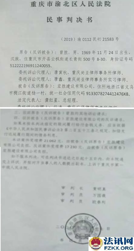 宏胜建设有限公司卖标被判无效 支付工程款 独立撰稿人 李堂平 日前,曾胜起诉宏胜建设公司(法人:龚红星 总经理)的建设工程施工合同纠纷一案有了结果:渝北区法院于2019年8月20日受理,2020年4月17日下达民事判决书。 渝北区人民法院(2019)渝0112民初21583号民事判决书显示:原告(反诉被告)曾胜向渝北区法院提出诉讼请求:1.原、被告签订的《管理输出施工承包协议书》无效: 2.被告向原告支付工程款1859288.55元并以1859 2855元为本金从2019年7月9日起按中国人民银行同期贷款利率计算资金占用损失至付清之日止:诉讼费由被告承担。事实及理由: 2014年7月4日,原、被告签订《管理输出施工承包协议书》,约定工程名称渝北区双凤桥片区汇流积水整治工程,合同价款22143559元, 2019 年1月25日,建设单位重庆临空都市基础设施建设运营有限公司与原、被告三方签订《基本建设工程结算审核定案表》,显示审定金额19388482.16元,三方签字盖章。渝北区审计局审计金额也为19388482.16元。原,被告签订的承包协议无效,被告已收到建设单位支付的工程款并支付给了原告16599533.9元,被告代原告向第三方支付853300.4元、被告垫付前述教项利息76388.31元,剩余1859288.55元工程款一直未支付给原告,故原告起诉来院。 被告(反诉原告)宏胜公司辩称,原、被告系内部承包关系,合同有效;原告就工程款、民工工资、罚款等出具了数份承诺书,并认可其应得款项被告已全部付清,故被告不应再向原告支付任何款项,被告(反诉原告)宏胜公司向本院提出反诉请求: 1.原告立即支付被告1548853.08元及利息868695.45元、律师费20000元、违约金1000000元、罚款20000元,并以853.08元为本金自2019年9月17日起按照月利丰2%的标准支付利息至付清时止:诉讼费由原告承担。事实和理由:被告于2014年7月4日将渝北区双风桥片区汇流积水整治工程内部承包给原告施工,原告于2016年7月5日向被告出具《承诺书》,承诺“不拖欠民工工资,若有拖欠造成的责任损失由本人承担,并支付20000元罚款”,又于2017年7月4日出具《承诺书》,承诺“施工期间所产生的一切经济纠份和法律纠纷由我承担”,于2017年12月13日出具《已完工工程承诺书》,承诺“施工过程中无欠款纠纷或案件,若有均由本人负责处理并承担全部责任即费用,且向公司支付违约金1000000元...…造成公司损失的利息按月利率4%承担,本人承担诉讼费及律师费”。因原告在施工过程中引起诉讼导致被告承担了相应款项,故被告提起反诉。 渝北区法院经审理认定事实如下:重庆市建龙城市建设工程有限公司就渝北区双凤桥片区汇流积水整治工程进行招投标,被告中标,中标金额22143559元。2014年6月20日,重庆市建龙城市建设工程有限公司与被告签订《建设工程施工合同》,将渝北区双凤桥片区汇流积水整治工程发包给被告施工,约定签约合同价22143559元,以渝北区审计局的审定价格作为结算价。2014年7月4日,以被告为甲方、原告为乙方,签订《管理输出施工承包协议书》,主要约定:工程名称渝北区双凤桥片区汇流积水整治工程,合同价款22143559元,根据工程中标价向甲方交纳1.5%的管理费,对应合同金额管理费在甲方收到业主第一次支付的工程款时扣除,最終管理费的收取按实际结算金额计算。 同日。原告还向被告出具《承诺书》:渝北区双凤桥片区汇流积水整治工程已经中标、由宏胜公司与重庆市建龙城市建设工程有限公司签订该工程施工合同,我同意本工程施工合同中的所有条款合同中宏胜公司的责任和义务均由我承担……施工期间所发生的一切经济纠纷和法律纠纷均由我承担并负责协调解决,与宏胜公司无关,现请责公司完善与建设单位签订施工合同的手续,我再与贵公司签订管理输出施工承包协议书。 原告对案涉工程实际施工。 2016年7月5日,原告向被告出具《承诺书》:承诺该项目先工后不拖欠民工工资,若有拖欠情况造成的一切责任损失均由本人承担,并向贵司交付20000元罚款。 2016年10月10日,案涉工程验收合格。 2017年12月13日,原告向被告出具《已完工程承诺书》:一是本人在施工过程无其他欠款纠纷或案件,日后被发现对公司存在隐瞒、提供虚假付款资料,尚存在其他案件或欠款纠纷的,均由本人负责处理并承担全部责任及费用,且愿就此向贵公司支付违约金100万元:二是因该工程所产生的行政处罚,民事纠纷等一切支付的责任,均由本人负责处理并承担全部责任及费用,若由此造成贵公司损失的,贵公司可以直接向本人追偿或索赔,利息损失按月利率结算4%承担,并由本人承担各项诉讼费、律师费等费用。 2019年1月25日,重庆临空都市基础设施建设运营有限公司,重庆市渝北区审计局,原告、被告签署《基本建设工程结算审核定案表》,案涉工程送审金额19816966.49元,审定金额19388482.16元。 2019年3月12日,重庆市渝北区审计局出具《审计报告》和《审计决定书》,审核造价为19388482.16元。 2019年7月20日,原告向被告出具《承诺书》:承诺本工程的所有分包工程款、人工费、材料费、机械设备费用,人员工资、应缴纳的的税金等均已付清,无对外欠款,否则因此给宏胜公司带来的所有损失由本人承担。 重庆临空都市基础设施建设运营有限公司已于2019年7月8日向被告支付了最后一笔工程款278894826元、付清了全部工程款19388482.16元。 另查明2018年3月1日,我院作出(2018)渝0112执2289号协助执行通如书,