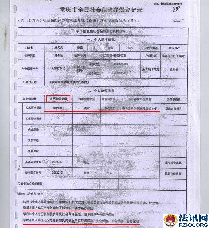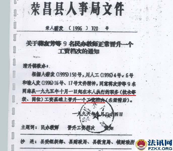 ▲图为:荣昌县教育局颁发的教师证 人事部 财政部 国家计划委员会《人薪发【1995】150号》(机关、事业单位工作人员正常晋升工资档次办法)、四川省人事厅 财政厅 计划委员会《川人工【1996】4号》文件,规定机关、事业单位正式工作人员中,凡1993年10月1日工资制度改革后,两年考核成绩均为称职(合格)以上的人员,可从1995年10月1日起在本职务(技术等级)所对应的工资标准内晋升一个工资档次。考核不称职(不合格),以及两年中只有一年考核称职(合格)的人员,不得晋升工资档次。胡天凤已享受其待遇。   ▲图为:荣人薪发【1996】720号文件,胡天凤已享受在册中小学教师提高10%的工资 1999年,57岁的胡天凤老师,站在三尺讲台,连续任教36年,已超过法定退休年龄。同年12月,胡天凤根据家里实际情况,遂向学校申请退休,学校还组织了欢送。 2006年,全县落实从1994年至2006年津补贴政策,在职教师每人每月69元,退休教师每人每月49元,胡天凤因未得到该补贴,才开始了解情况,先后得到的回复是“你是临时代课教师,已被2001年的102号文件辞退”。 胡天凤持有清升镇甘桥完全小学发放的小学一级教师聘书、重庆市人民政府发放的小学一级教师专业技术资格证书、荣昌县教育局发放的小学一级教师证,历年来工资表上显示的是“退休教师”,2008年清升镇回龙完全小学也为“单位职工胡天凤”购买了“城镇职工医疗保险”(卡号:A78152410)。然而,在2010年荣昌县教育局信访回复,胡天凤的身份又是“临时代课教师”,荣昌县教育局并未将荣昌县教育局、荣昌县人事局作出的《荣教人发【2001】102号》(关于辞退和妥善安置“享受正式民师待遇”教师的通知)送达胡天凤知晓,是2014年庭审中才知道增加了50元钱后作为被“辞退”的依据。事实上,该文件明确的是:“凡教龄男满30年,女满25年的,享受正式民师待遇的教师,1998年以来未调整工资的,在现行月工资标准的基础上,可增加50元后,再按两项之和的100%计发月安置费”,《荣人薪发【1996】720号》文件已对身份进行了确认,就不应对胡天凤增加50元。其增加了50元,就是以发放安置费代替退休。  ▲图为:2006年8月3日,清升镇甘桥完全小学校校长的证明