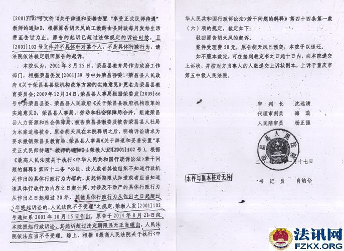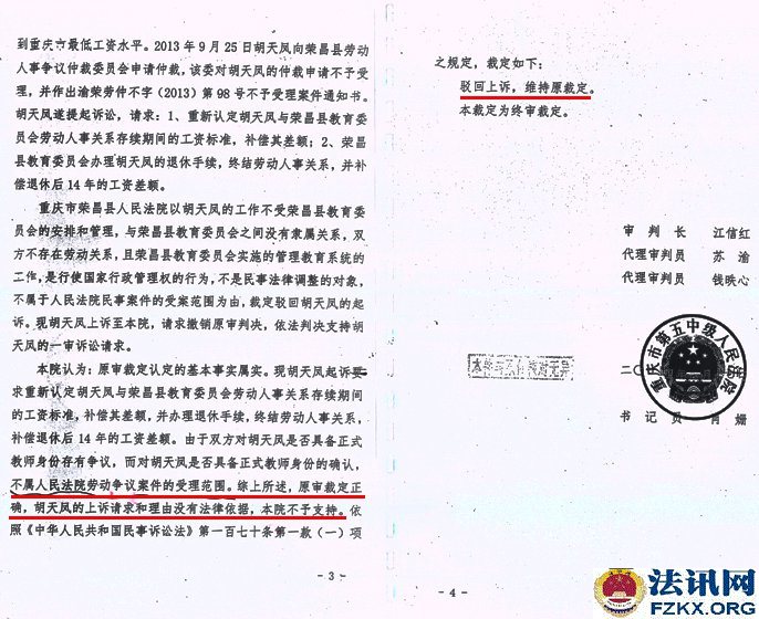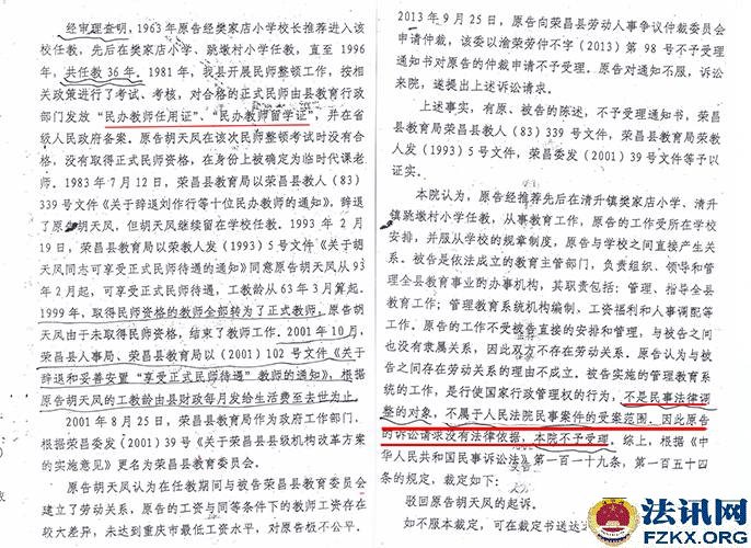▲图为:荣昌县教委信访回复胡天凤是“临时代课教师” 2013年,胡天凤将荣昌县教委诉讼到法院,要求教委以小学一级教师待遇,重新认定与教委劳动人事关系存续期间的工资标准,补偿其差额,办理退休手续,终结劳动人事关系,并补偿退休后14年的工资差额 ,法院认为不属于民事案件的受理范围,二审也驳回上诉、维持原判。  ▲图为:民事一审判决