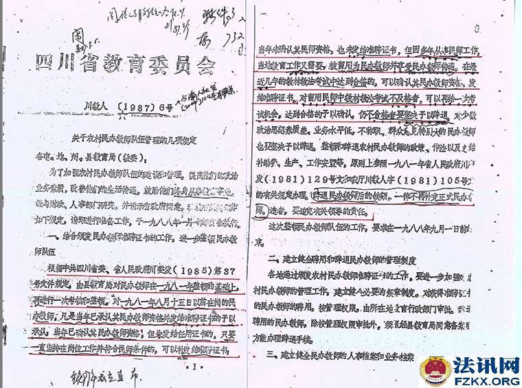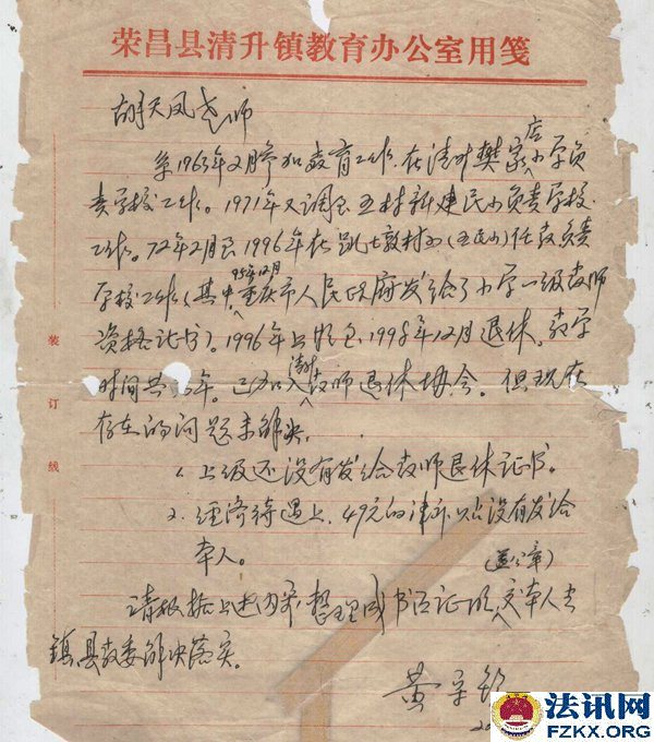 重庆荣昌小学一级教师胡天凤36年工龄 待遇不如五保老人 1963年,国家提倡创办民办学校,樊家店小学也就是在同年2月开始创办,胡天凤被樊家店村支部书记钟治高和樊家店小学负责人黎光琼推荐到该校,负责教育工作,从一至五年级语文、数学、思想品德、体育等课程包干。用胡天凤的话说,她是第一次也是第一个被推荐。然而,从未违纪违规的她,连续任教36年,一直又是学校负责人,却被悄悄辞退,至今每月工资只有384元,还不如一个五保老人(每人每月生活补助754元)。 事情得从1981年说起。 1981年全国民办教师整顿。《川府发【1981】129号》文件,要求对民师进行全面考核,除严格的文化考试外,还要认真考察其政治思想、工作态度、业务水平和健康状况,对连续教龄在15年以上的老民师,文化考察可适当放宽,但确实不能胜任教学工作的,也要辞退。 对个别思想品质恶劣、道德败坏,不堪为人师表的人,应取消民师资格。 对工作极为不负责,或者身体条件不宜做教师的,也要调整。经过考核合格的教师,由县教育局发给任用证书,发放任用证书应从严控制。 对过去发放面广、未保证质量的,要按上述要求,重新进行考核,另发任用证书。 对调整出去的民师应做好思想工作,学校要热情欢送,社队要热情欢迎,由生产队妥善安排,有条件的也可安排到社队企事业单位。对于被辞退的民师,可酌情发给一次性的少量补助费,具体办法由教育厅另文下达,今后一律不再补充正式民师。 如调整后教师有缺额时,可聘请代课教师。  ▲图为:川府发【1981】129号文件;查阅时间:2018.08.24 胡天凤还未进入考场,突然生病,不能坚持答卷,可查阅试卷注释。清升公社民办教师管理小组在辞退名册上认定的是“缺级”,意见是“留用”,双河区公所意见是“辞退”,备注胡天凤是初中文化,教学态度端正,质量效果较好,本人基础知识较差。 此时,荣昌县教育局并未让胡天凤知晓辞退的事情,而是继续任教。  ▲图为:辞退名册;2013.11.07荣昌县教育局在法庭上提供 《川教人【1987】6号》文件规定,当年未确认其民师资格,也未发给准聘证书,但因多年从事民师工作,当地教育工作又需要,被留用为民办教师并享受民办教师待遇,在最近几年的教材教法考试中达到合格的,可以确认其民办教师资格,发给准聘证书。对留用民师教材教法考试不及格者,可以再给一次考试机会,达到合格的予以确认,仍不合格者要坚决予以辞退。辞退民办教师后的缺额,一律不再补充正式民办教师,违者,要追究有关领导的责任。 胡天凤既然已经被“辞退”,还让其继续任教36年,根据《川教人【1987】6号》文件规定,当时的有关领导并未被责任追究。  ▲图为:川教人【1987】6号文件;查阅时间:2019.05.16 1990年荣昌县清升镇甘桥完全小学作出《关于胡天凤同志近年来的政治表现、教育教学情况》,称胡天凤同志热爱党,坚持四项基本原则,忠诚党的教育事业,自觉执行党的路线,旗帜鲜明地反对动乱,利用各种不同的活动,对学生进行形势教育,教育学生热爱党,热爱社会主义祖国。还称胡天凤热爱教育事业,具有良好的职业道德,能团结同志,热爱学生,以身作则,为人师表,刻苦钻研业务,教育教学效果好。该同志一直担任学校负责工作,受到领导、同事和学生家长的好评。点校交叉统考情况:1989年上期,三年级语文及格率为90%,数学及格率为90%;下期,一年级语文及格率92.1%,数学及格率为95%;1990年上期,一年级语文及格率为95.2%,数学及格率为93.5%。 有了清升镇甘桥完全小学作出的《关于胡天凤同志近年来的政治表现、教育教学情况》,已经符合川教人【1987】6号文件精神,就应发放《任用证书》。  ▲图为:政治表现、教育教学情况;清升镇甘桥完全小学提供 荣昌县教育局《荣教人发【1993】5号》文件关于胡天凤同志可享受正式民师待遇的通知,工教龄从1963年3月算起。1994年9月胡天凤被清升镇党委、清升镇政府评为先进教师;1994年12月4日,清升镇甘桥完全小学聘胡天凤为一级教师;1994年12月,重庆市人民政府授予胡天凤为小学一级教师,并颁发专业技术资格证书;1995年12月8日,荣昌县教育局为胡天凤颁发了小学一级教师证。  ▲图为:荣教人发【1993】5号文件,查阅时间:2007.09.21  ▲图为:清升镇党委、镇政府颁发的先进教师奖状   ▲图为:专业技术职务聘书    ▲图为:重庆市人民政府授予的小学一级教师专业技术资格证书