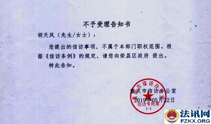 ▲图为:二审行政裁定 2019年5月22日,重庆市信访办公室回复,让胡天凤向荣昌区政府提出。荣昌区政府又责成区教委处理,区教委又作出不予受理的书面告知。称提出的信访事项依法应该通过诉讼途径解决,请向重庆市荣昌区教育委 人民法院提出。荒唐的是,荣昌区教委已经作出不予受理的书面告知,还让胡天凤向荣昌区教委提出!