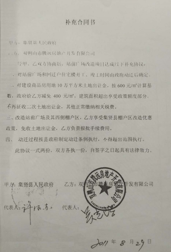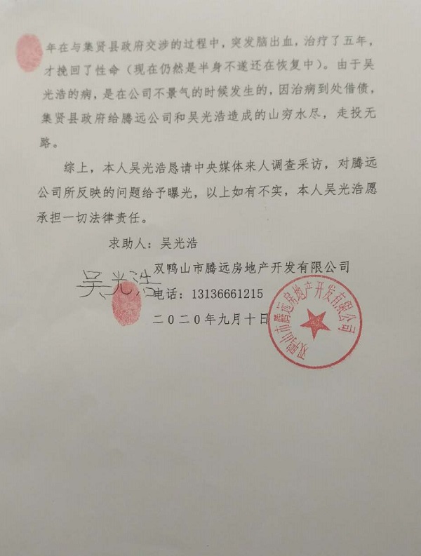 求 助 信 中央媒体: 我是黑龙江省双鸭山市腾远房地产开发有限公司(简称腾远公司)的法定代表人吴光浩。我实名举报黑龙江省双鸭山市集贤县人民政府滥用职权,乱作为、不作为、欺上瞒下的违法乱纪事实。由于集贤县政府的违法行为,致使腾远公司债台高筑,颇临破产的边源。举报事实如下: 一、2011年8月29日,集贤县政府与腾远公司就站前广场项目改造工程签订了合同书及补充合同书。 二、腾远公司按合同书约定开始办理站前小区建设相关手续时,发现集贤县政府福利屯站前广场及西侧棚户区改造工程涉及的18.5亩铁路用地使用权非集贤县政府所有。在 土地权属不清的情况下,集贤县政府竟以欺瞒的方式将腾远 公司招商中标引进,致使腾远公司不能按预期时间办理不动产权证书、建设用地规划许可证、建设工程规划许可证、建筑工程施工许可证、商品房预售许可证。 三、集贤县政府在腾远公司不具备动工开发所必需的基本条件下,强行违法乱纪要求腾远公司进行开发施工。 四、腾远公司因集贤县政府的欺瞒行为导致上述五证不能如期办理(足足推迟了6年时间),腾远公司不能如期预售房屋,致使腾远公司工程资金链断裂。无奈的情况下,腾远公司只能高利息贷款。 由于集贤县政府的违约行为,给腾远公司造成直接经济损失达6亿余元。 五、集贤县政府与腾远公司合同约定,为弥补腾远公司亏损,并获合理利润,集贤县政府为腾远公司提供建设商品房用地10万平方米,但集贤县政府只给腾远公司71314平方米土地,余下的28686平方米土地在腾远公司不知情的情况下,转卖给了他人。 六、集贤县政府的欺上瞒下、胡作为、乱作为、不作为的及其不负责的行径,使腾远公司损失惨重,举步维艰,难以度日,几近垮掉。 在此情况下,腾远公司法定代表人吴光浩多次、多年找到了历届县长,反映腾远公司的情况(2011年-2016年许德东任县长,2016至2018年李凯任县长,2019年至今郭伟任县长)。而集贤县政府一拖再拖,不予解决。由于集贤县政府不作为,腾远公司在2013年就损失1500万元,到2020年损失达6亿多元。每届县长都是给付一千多万元应付了事。三届县长共给付五千余万元。从签订合同到现在已经九年的时间了,腾远公司找集贤县政府,可政府的门都进不去。集贤县政府给腾远公司造成的损失,集贤县政府视而不见。 由于集贤县政府不作为,给腾远公司造成严重损失。腾远公司的法律代表人吴光浩急火攻心,焦虑成疾,于2015年在与集贤县政府交涉的过程中,突发脑出血,治疗了五年,才挽回了性命(现在仍然是半身不遂还在恢复中)。由于吴光浩的病,是在公司不景气的时候发生的,因治病到处借债,集贤县政府给腾远公司和吴光浩造成的山穷水尽,走投无路。 综上,本人吴光浩恳请中央媒体来人调查采访,对腾远公司所反映的问题给予曝光,以上如有不实,本人吴光浩愿承担一切法律责任。 求助人:吴光浩 双鸭山市腾远房地产开发有限公司 电话:13136661215 二0二0年九月十四日 集贤县站前广场项目改造工程启动剪彩仪式现场 |